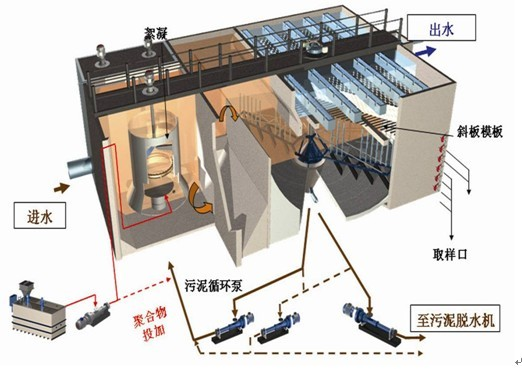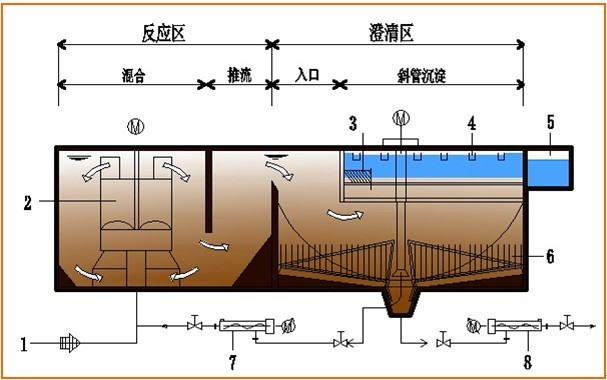 1—進水 2—反應(ying)池 3—斜管 4—集水槽 5—出(chū)水 6—刮 泥機 7—污泥循(xun)環 8—污泥排放